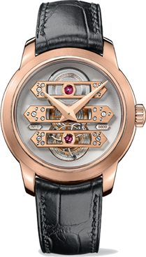 Tourbillon: 72 components weighing a total of 0.3 grams, one rotation per minute, upper and lower carriages beveled and polished by hand, escapement and pallet bridges beveled and polished by hand
