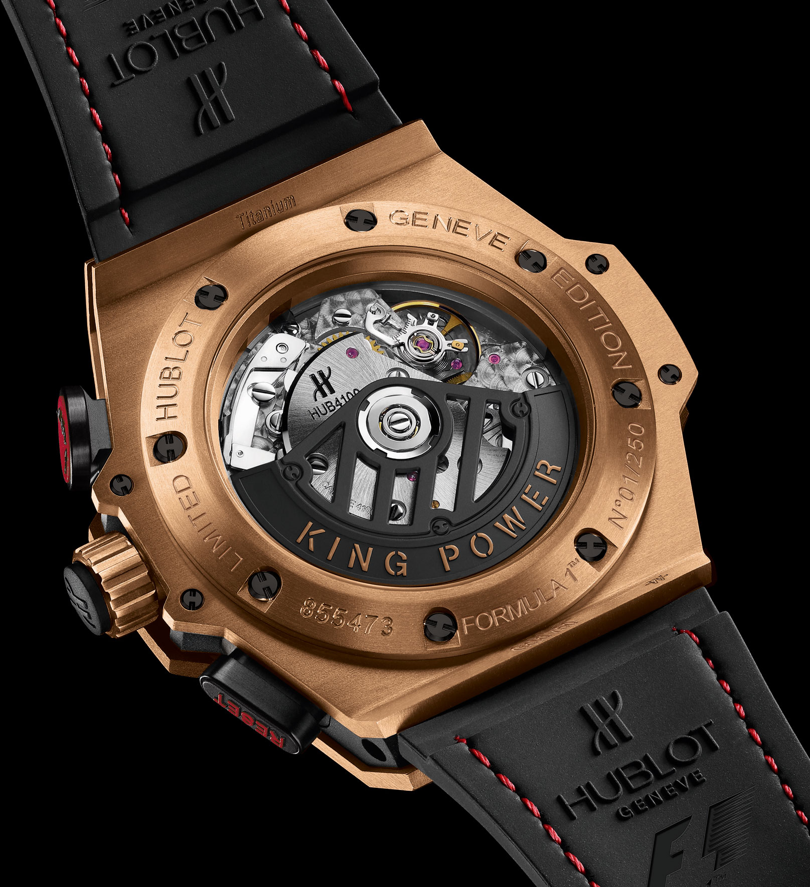 As for the movement the Formula 1 Hublot Great Britain is enriched with the in-house HUB4100 Mechanical chronograph with automatic winding movement, comprising of 252 components  and 27 Jewels and it has a power reserve of 42 hours.