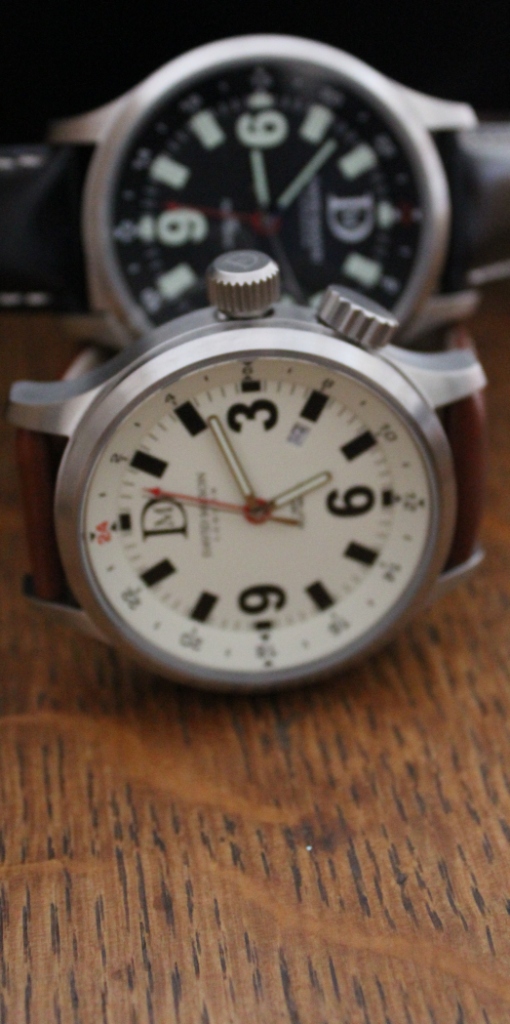 On to the watch, this is a typical Pilot Watch per-say, exactly what you would expect it has the classic Pilot Watch shaped case with the added benefits of GMT. The GMT function comes to us on the DM1A and DM1B as an additional 24 hour ring and red hand with separate crown to set a home town time whilst abroad, so you are always aware of the time in two timezones at once. We found the 24 Hour ring works very well and is simple to adjust and set.